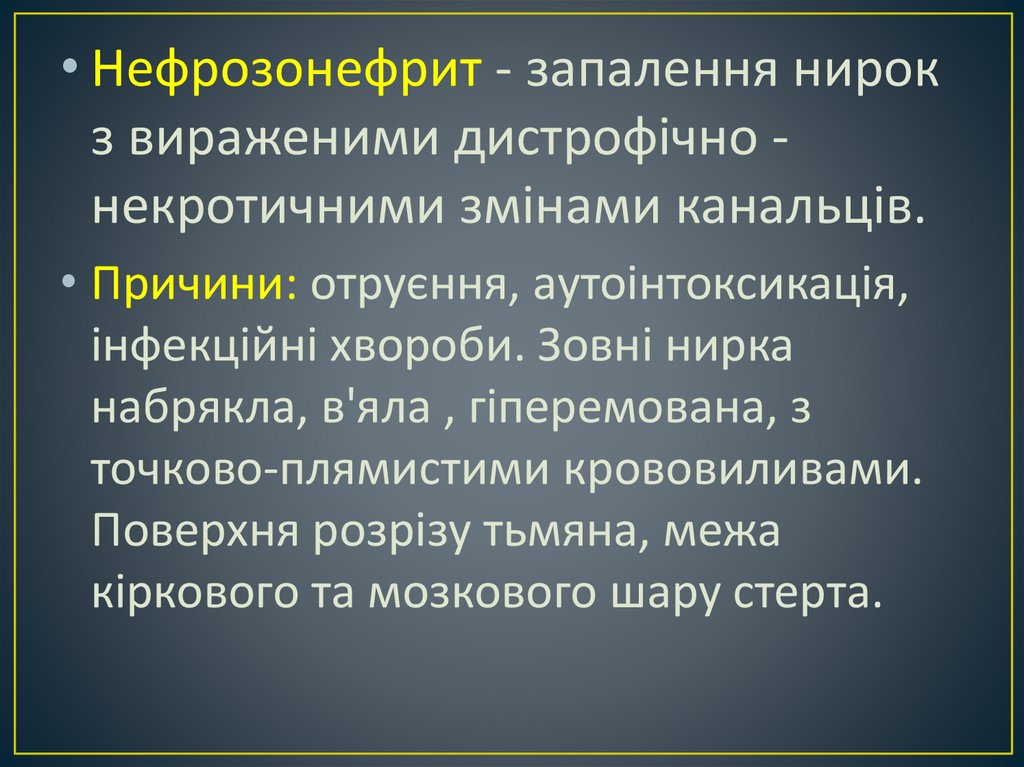 • Нефрозонефрит - запалення нирокз вираженими дистрофічно некротичними змінами канальців.