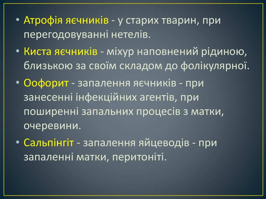 • Атрофія яєчників - у старих тварин, приперегодовуванні нетелів.