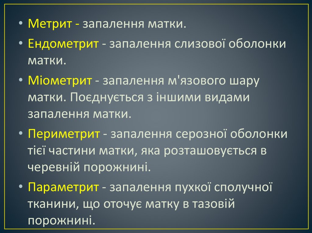 • Метрит - запалення матки.• Ендометрит - запалення слизової оболонки
