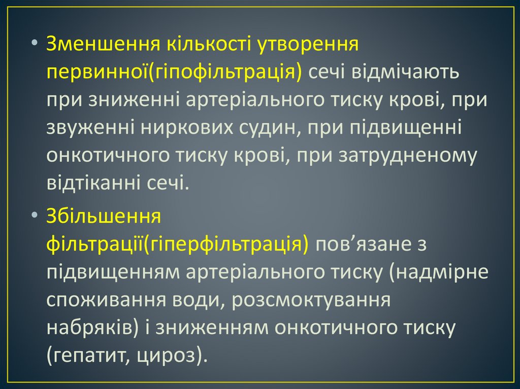 • Зменшення кількості утворенняпервинної(гіпофільтрація) сечі відмічають