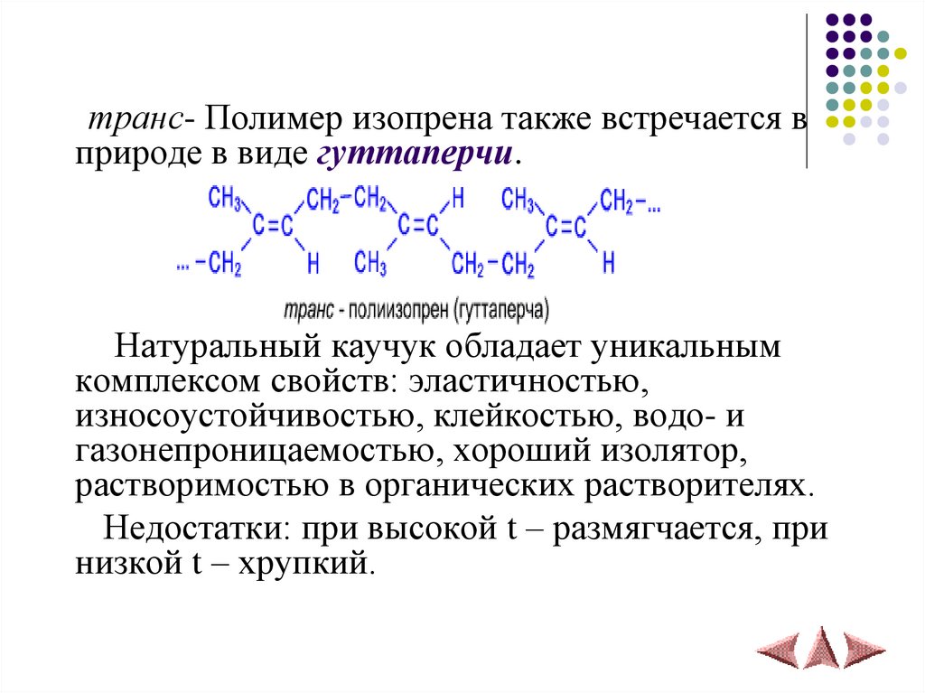 транс- Полимер изопрена также встречается вприроде в виде гуттаперчи.