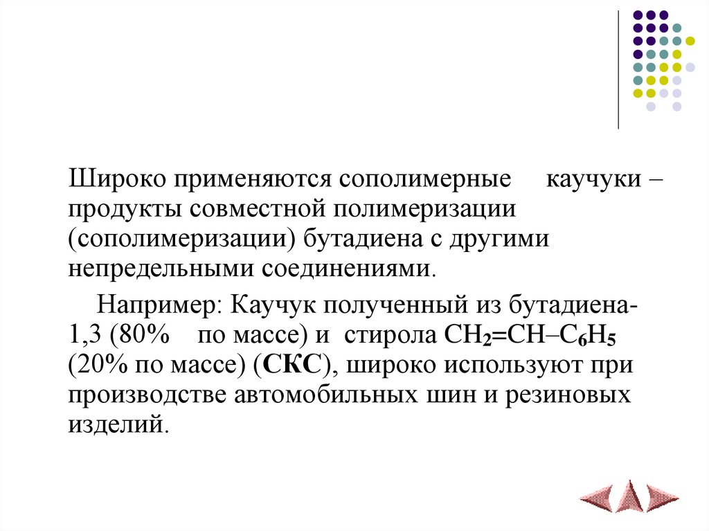 Например: Каучук полученный из бутадиена1,3 (80% по массе) и стирола CH2=CH–C6H5