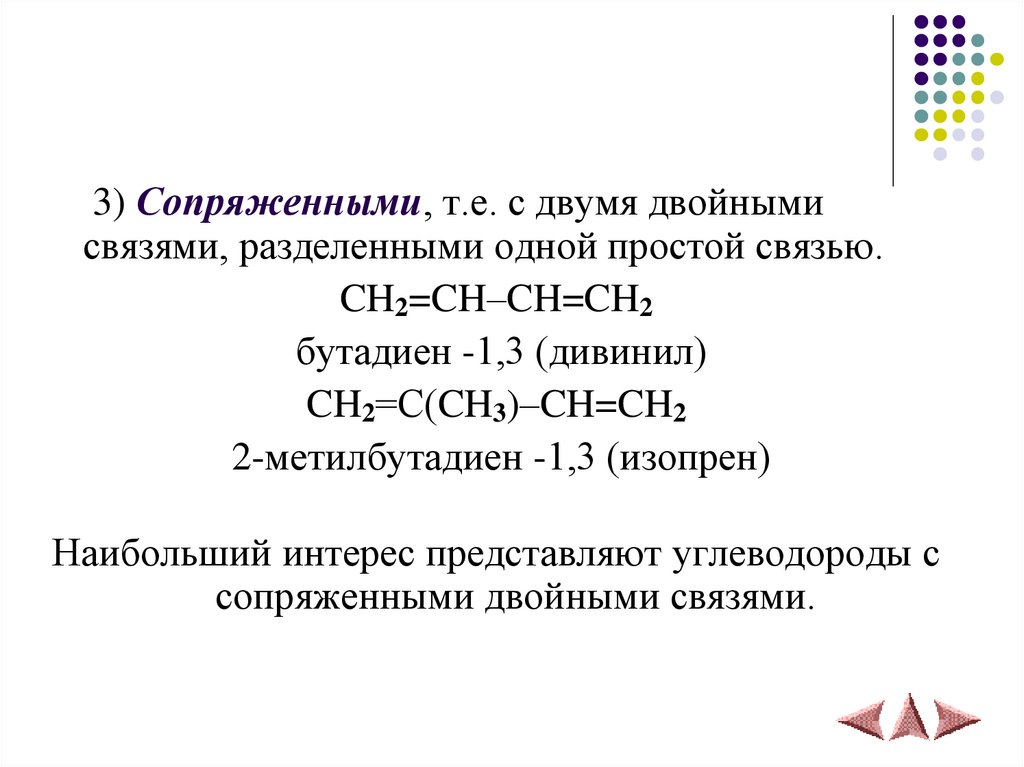 3) Сопряженными, т.е. с двумя двойнымисвязями, разделенными одной простой связью.