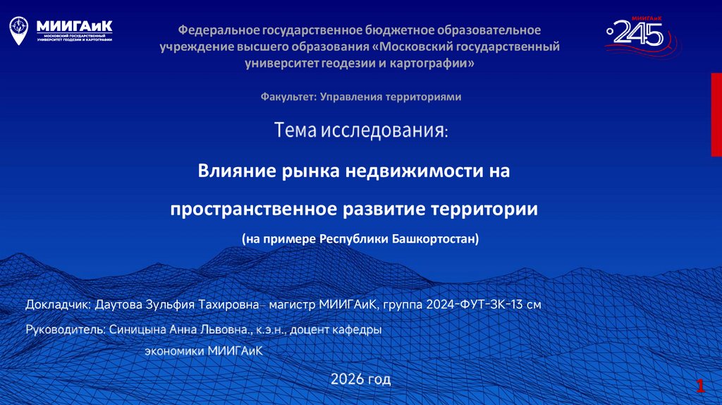 Докладчик: Даутова Зульфия Тахировна– магистр МИИГАиК, группа 2024-ФУТ-ЗК-13 см