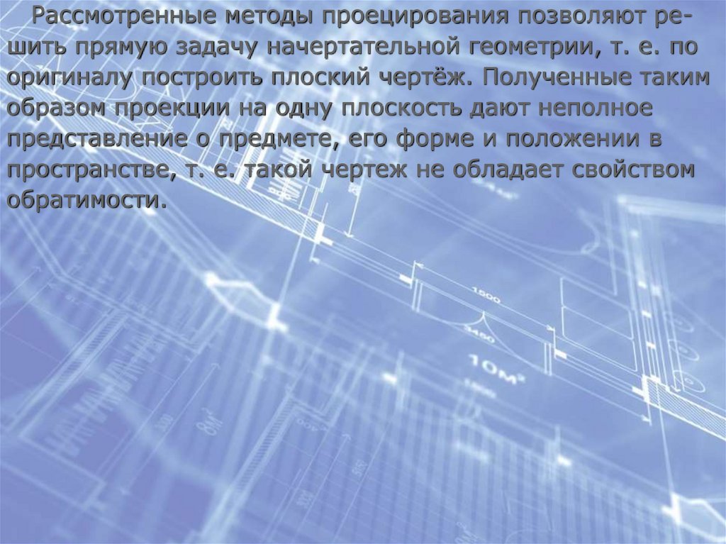 Рассмотренные методы проецирования позволяют решить прямую задачу начертательной геометрии, т. е. пооригиналу построить плоский чертёж. Полученные таким