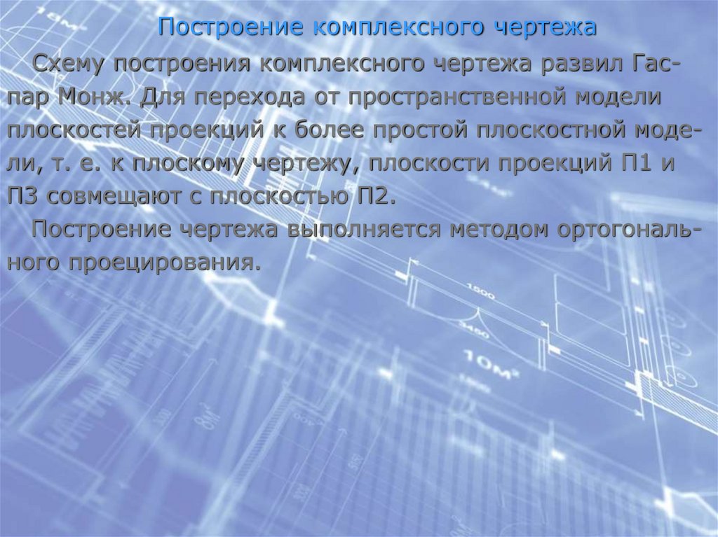 Построение комплексного чертежаСхему построения комплексного чертежа развил Гаспар Монж. Для перехода от пространственной модели