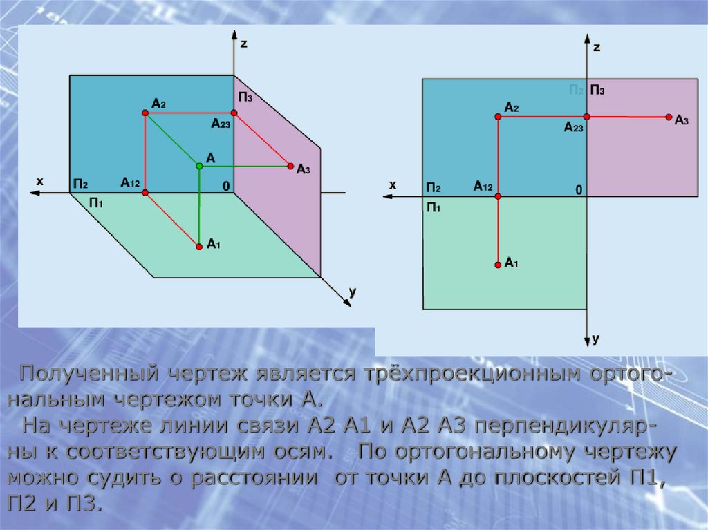 Полученный чертеж является трёхпроекционным ортогональным чертежом точки А.На чертеже линии связи А2 А1 и А2 А3 перпендикулярны к соответствующим осям. По ортогональному чертежу