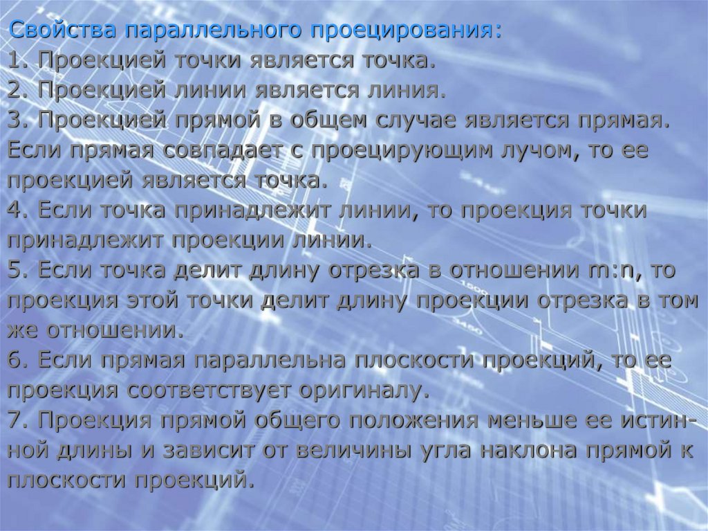 Свойства параллельного проецирования:1. Проекцией точки является точка.