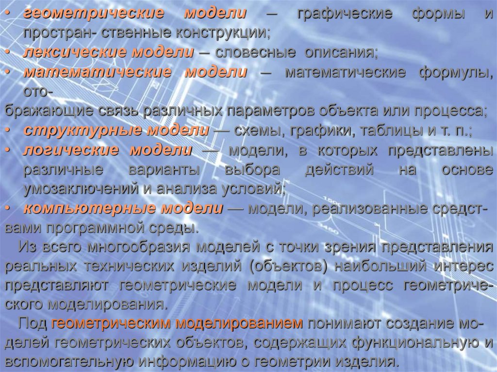 • геометрические модели — графические формы ипростран- ственные конструкции;