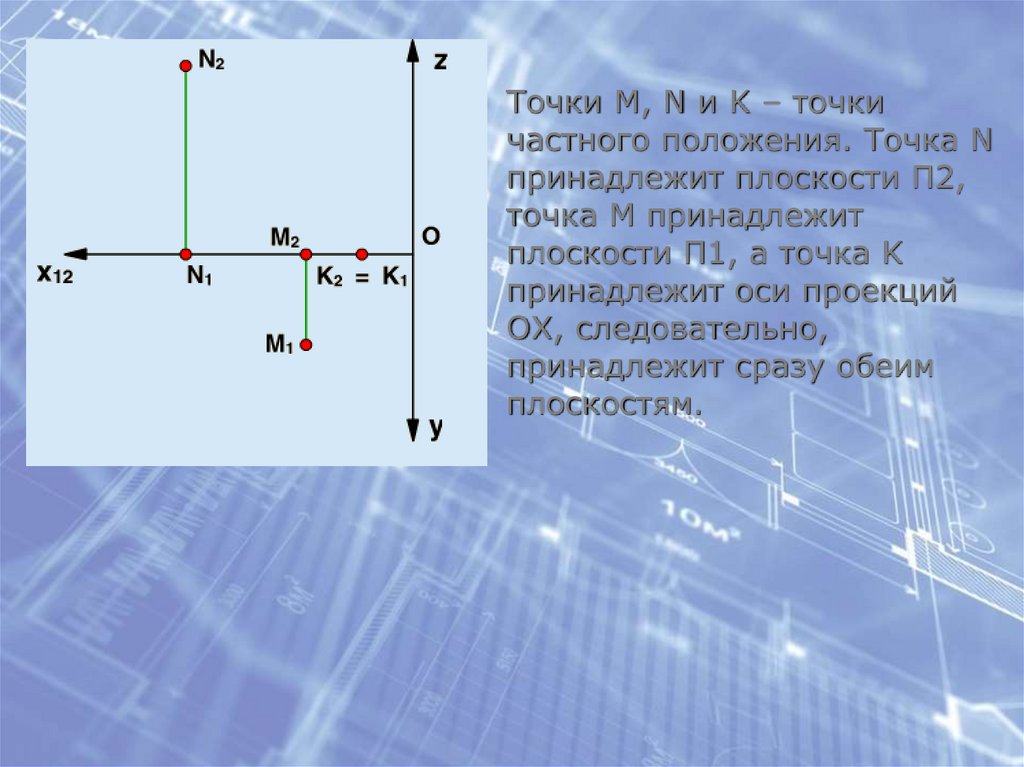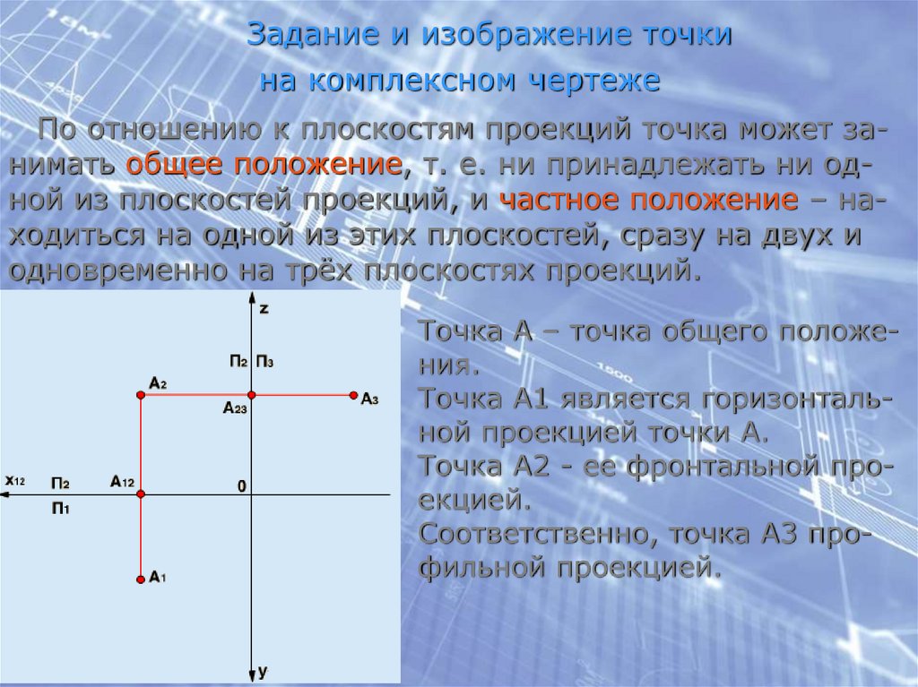 По отношению к плоскостям проекций точка может занимать общее положение, т. е. ни принадлежать ни одной из плоскостей проекций, и частное положение – находиться на одной из этих плоскостей, сразу на двух и