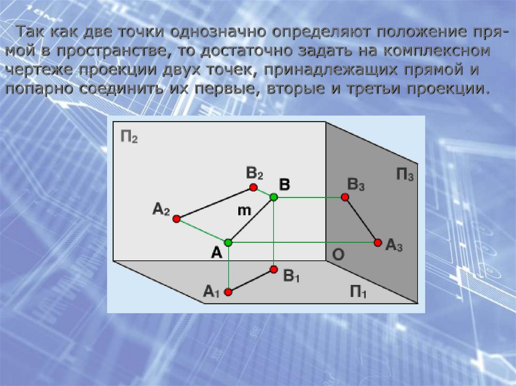 Так как две точки однозначно определяют положение прямой в пространстве, то достаточно задать на комплексномчертеже проекции двух точек, принадлежащих прямой и