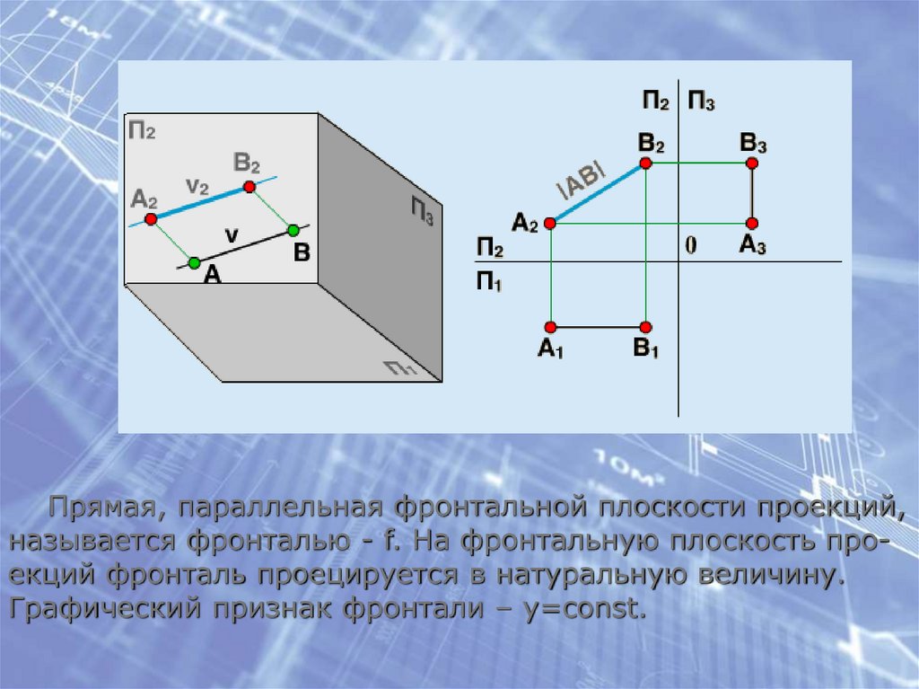 Прямая, параллельная фронтальной плоскости проекций,называется фронталью - f. На фронтальную плоскость проекций фронталь проецируется в натуральную величину.