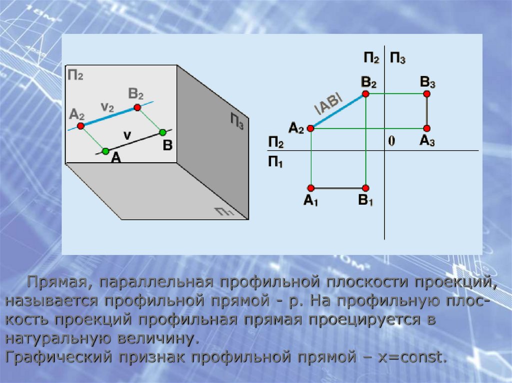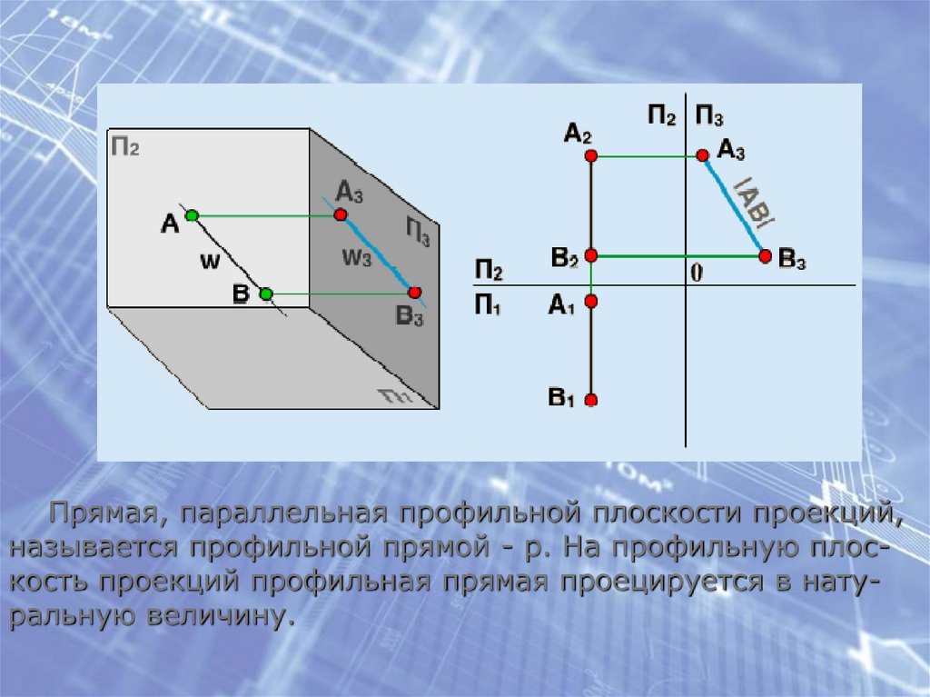Прямая, параллельная профильной плоскости проекций,называется профильной прямой - р. На профильную плоскость проекций профильная прямая проецируется в