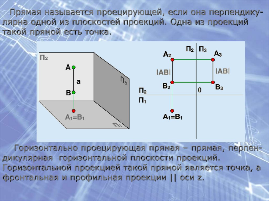 Прямая называется проецирующей, если она перпендикулярна одной из плоскостей проекций. Одна из проекцийтакой прямой есть точка.