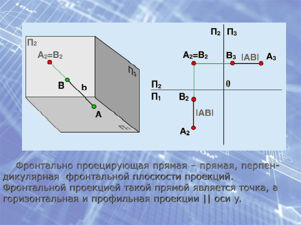 Фронтально проецирующая прямая – прямая, перпендикулярная фронтальной плоскости проекций.Фронтальной проекцией такой прямой является точка, а