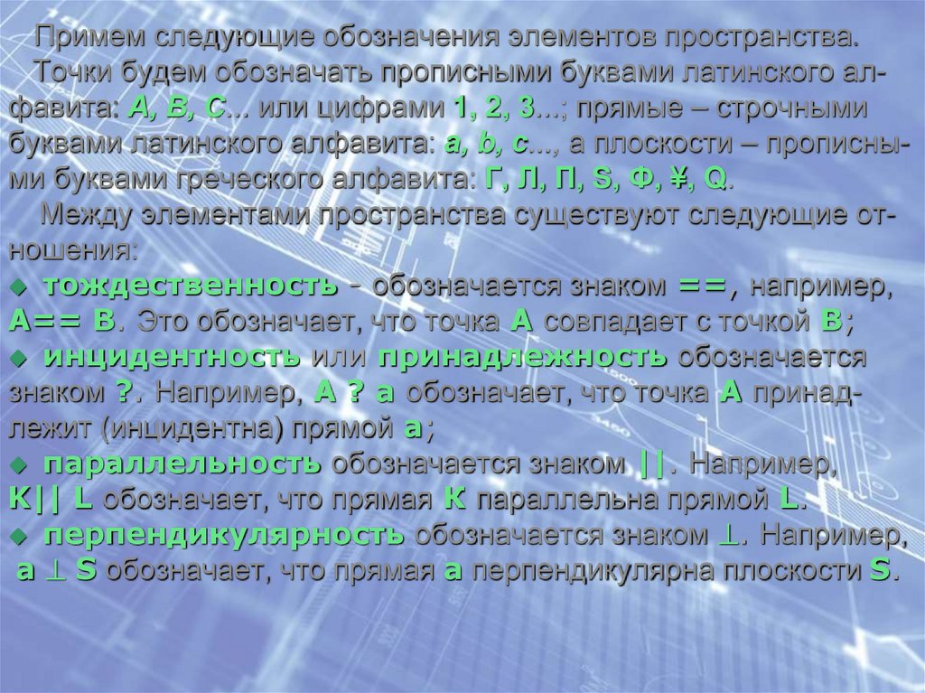 Примем следующие обозначения элементов пространства.Точки будем обозначать прописными буквами латинского алфавита: А, В, С... или цифрами 1, 2, 3...; прямые – строчными