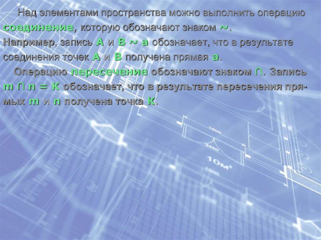 m ∩ n = К обозначает, что в результате пересечения прямых m и n получена точка К.