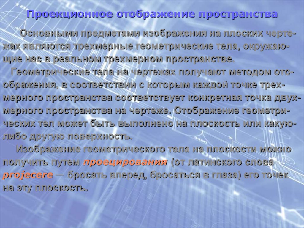 Геометрические тела на чертежах получают методом отоображения, в соответствии с которым каждой точке трехмерного пространства соответствует конкретная точка двухмерного пространства на чертеже. Отображение геометрических тел может быть выполнено на плоскость или какуюлибо другую поверхность.