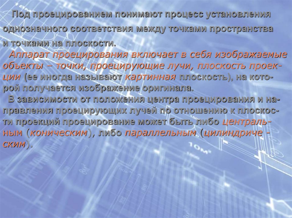 Под проецированием понимают процесс установленияоднозначного соответствия между точками пространства