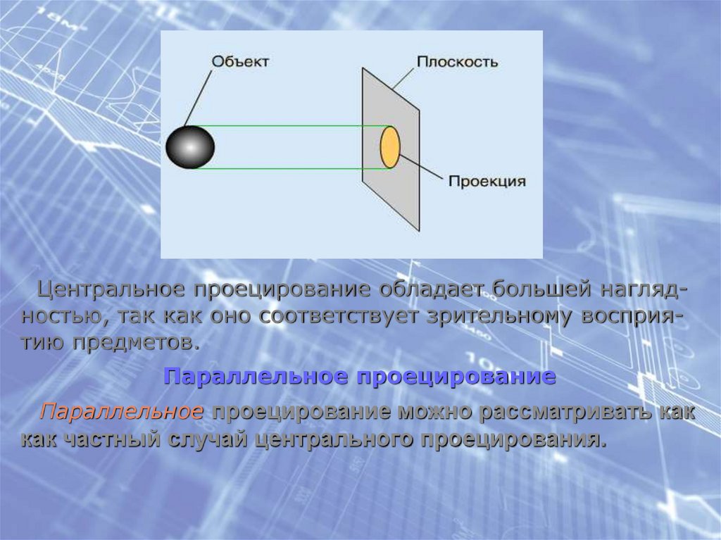 Центральное проецирование обладает большей наглядностью, так как оно соответствует зрительному восприятию предметов.Параллельное проецирование