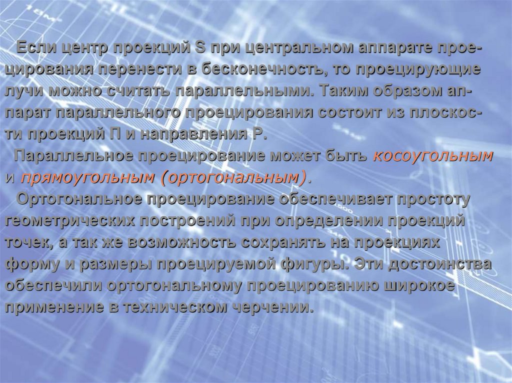 Если центр проекций S при центральном аппарате проецирования перенести в бесконечность, то проецирующиелучи можно считать параллельными. Таким образом аппарат параллельного проецирования состоит из плоскости проекций П и направления Р.
