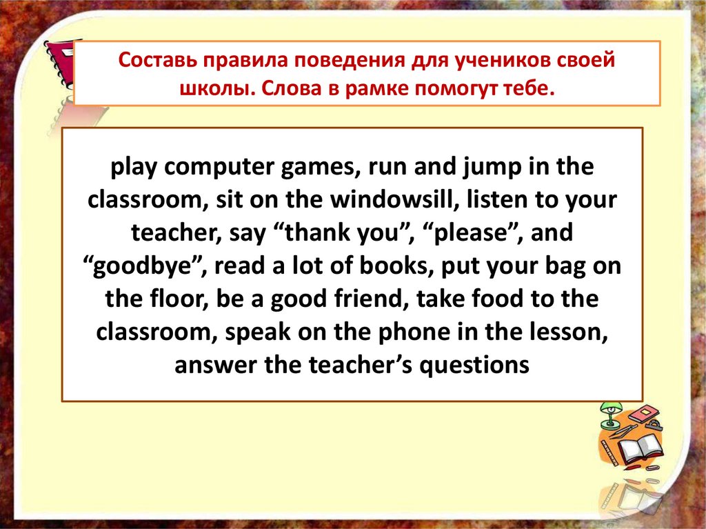 Составь правила поведения для учеников своейшколы. Слова в рамке помогут тебе.