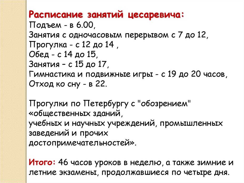 Расписание занятий цесаревича:Подъем - в 6.00,