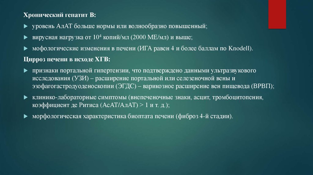 Хронический гепатит В:уровень АлАТ больше нормы или волнообразно повышенный;