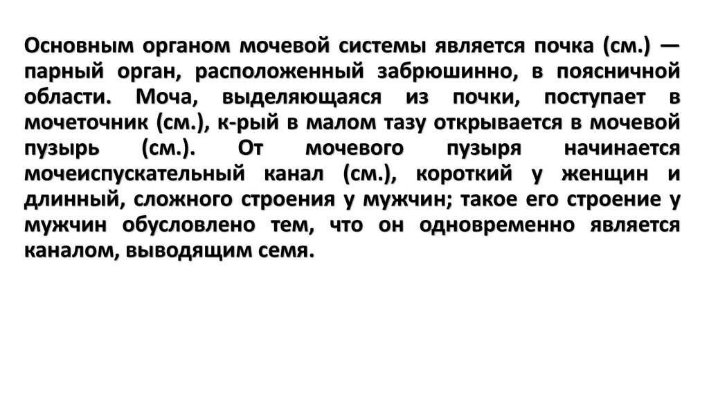 Основным органом мочевой системы является почка (см.) —парный орган, расположенный забрюшинно, в поясничной