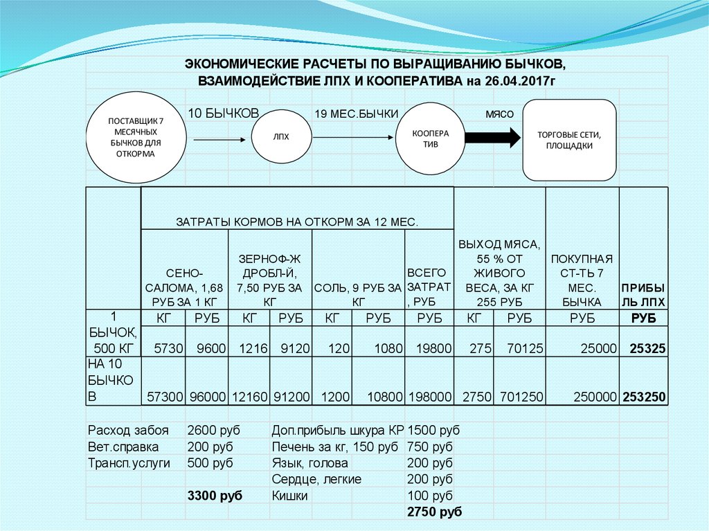 ЭКОНОМИЧЕСКИЕ РАСЧЕТЫ ПО ВЫРАЩИВАНИЮ БЫЧКОВ,ВЗАИМОДЕЙСТВИЕ ЛПХ И КООПЕРАТИВА на 26.04.2017г