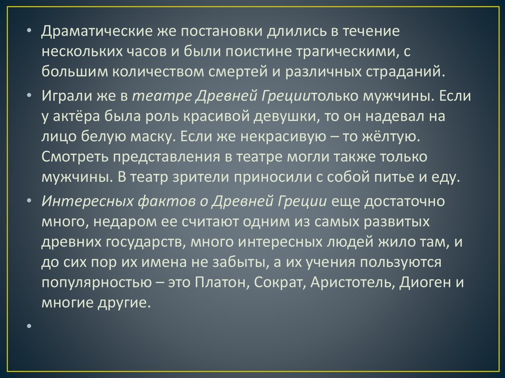 • Драматические же постановки длились в течениенескольких часов и были поистине трагическими, с