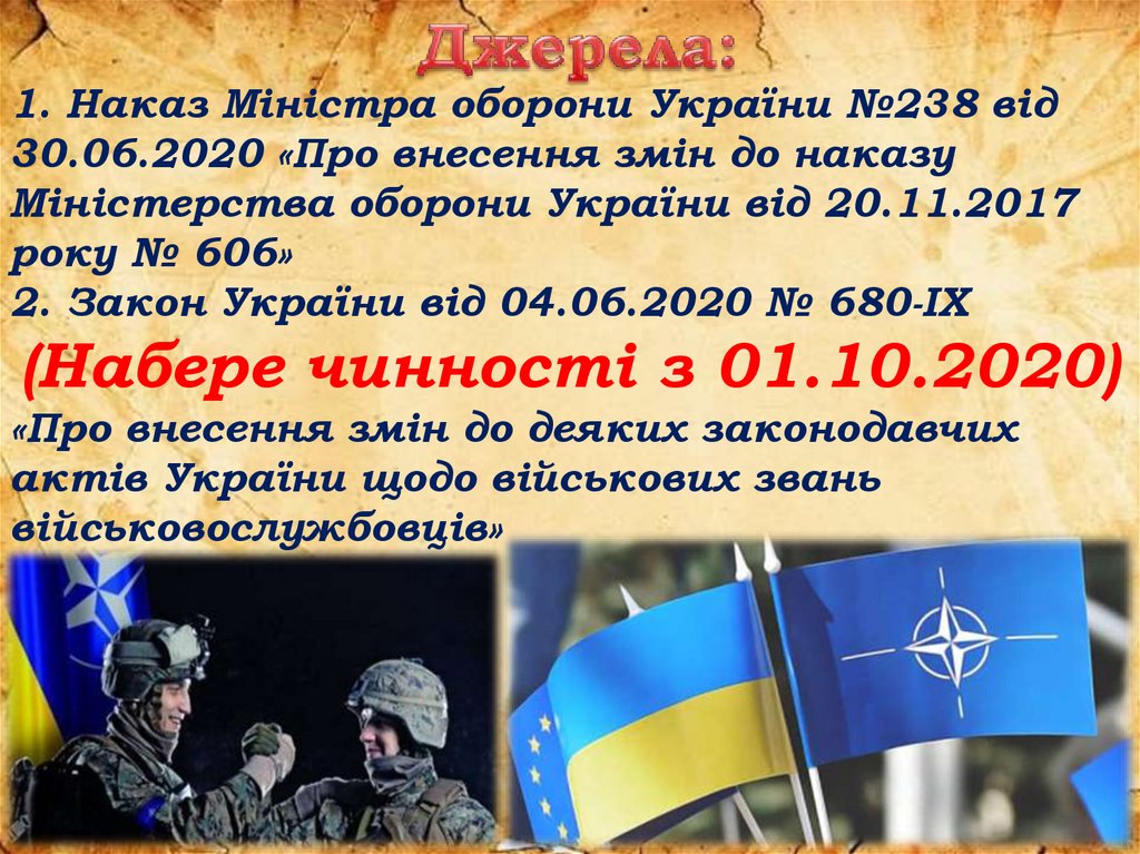 1. Наказ Міністра оборони України №238 від30.06.2020 «Про внесення змін до наказу