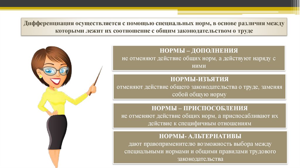 Дифференциация осуществляется с помощью специальных норм, в основе различия междукоторыми лежит их соотношение с общим законодательством о труде