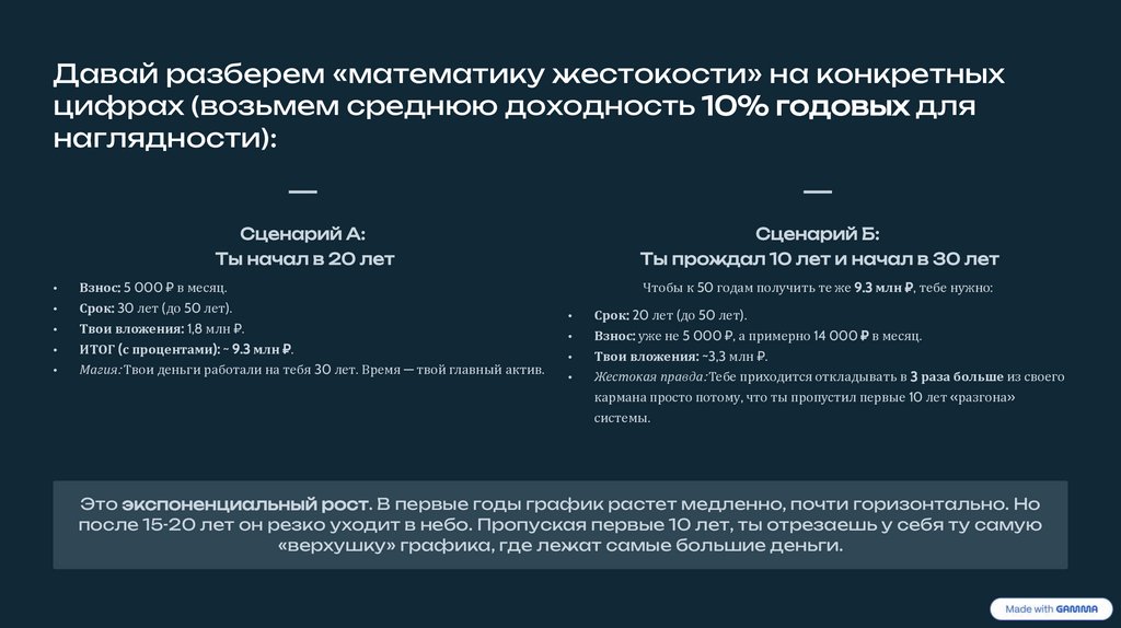 Давай разберем «математику жестокости» на конкретныхцифрах (возьмем среднюю доходность 10% годовых для