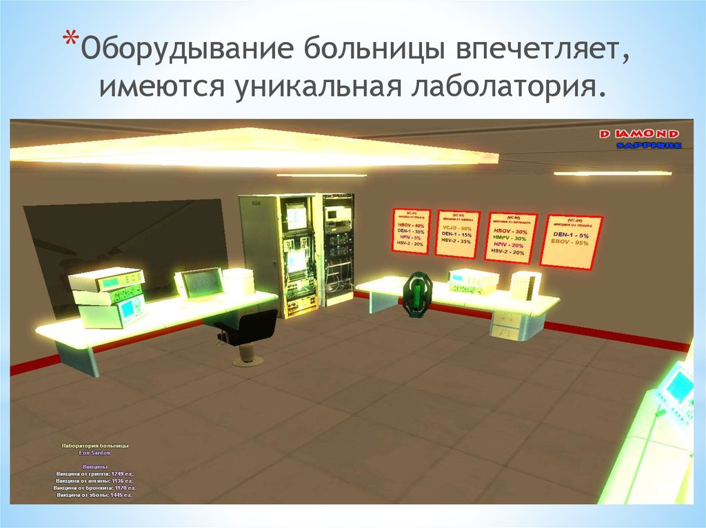 *Оборудывание больницы впечетляет,имеются уникальная лаболатория.