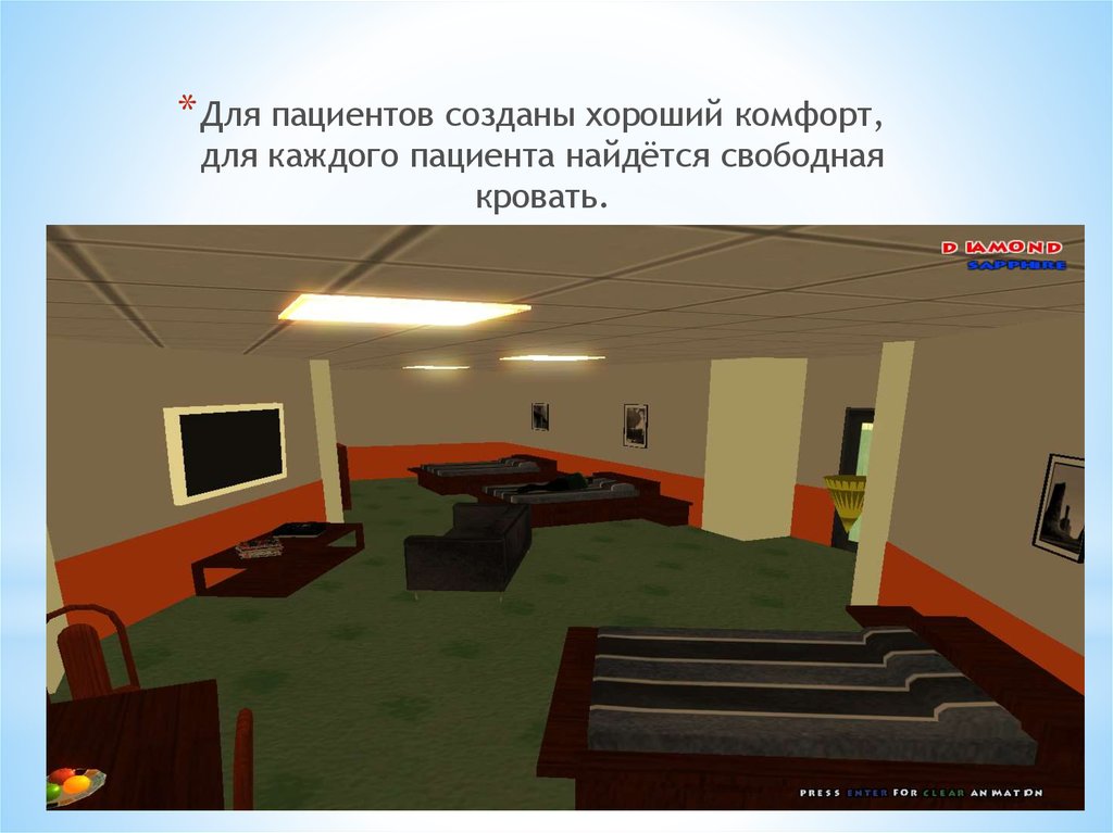 * Для пациентов созданы хороший комфорт,для каждого пациента найдётся свободная