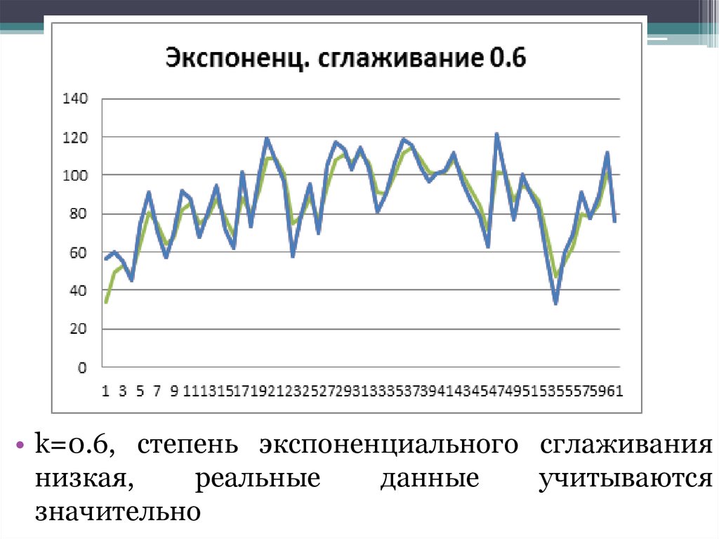 • k=0.6, степень экспоненциального сглаживаниянизкая,