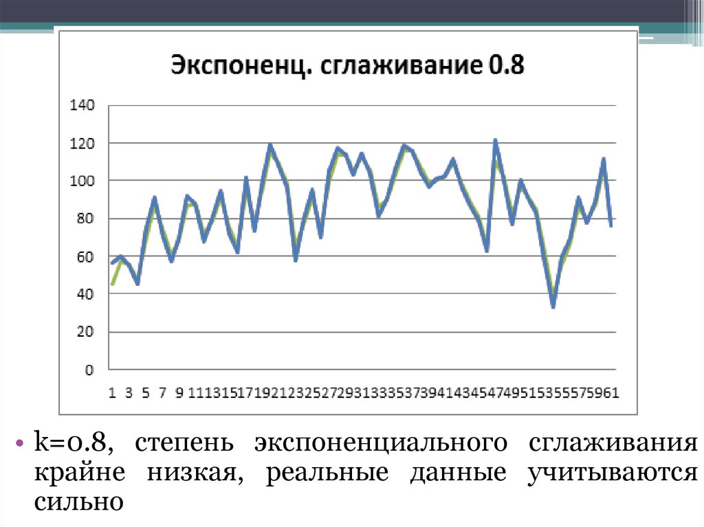• k=0.8, степень экспоненциального сглаживаниякрайне низкая, реальные данные учитываются
