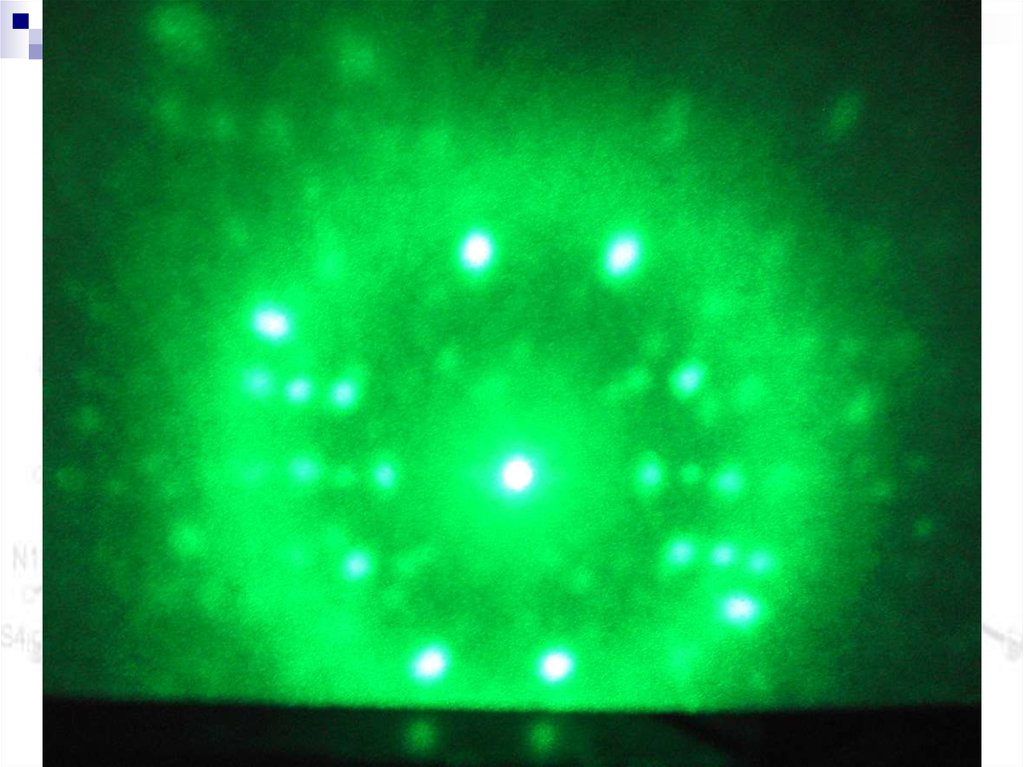 32. Фотография восстановленного изображения амплитудной голограммы плоского волнового фронта, записанной в пленке ФПК ОГК+10% Stilb. ω = 160 мм-1, со