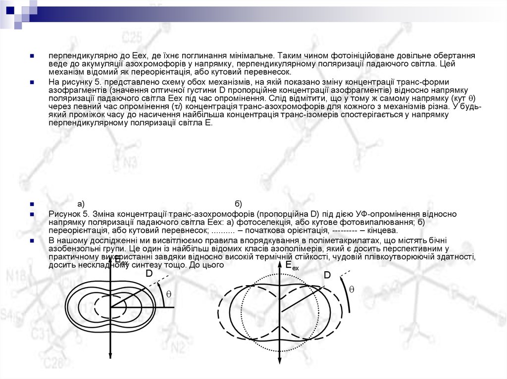 перпендикулярно до Eex, де їхнє поглинання мінімальне. Таким чином фотоініційоване довільне обертанняведе до акумуляції азохромофорів у напрямку, перпендикулярному поляризації падаючого світла. Цей
