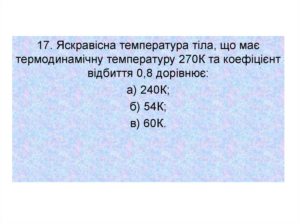 17. Яскравісна температура тіла, що маєтермодинамічну температуру 270К та коефіцієнт