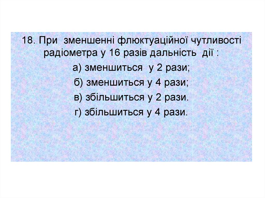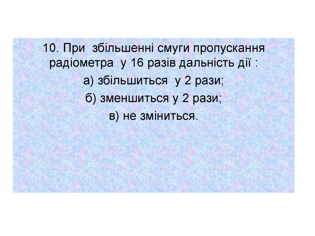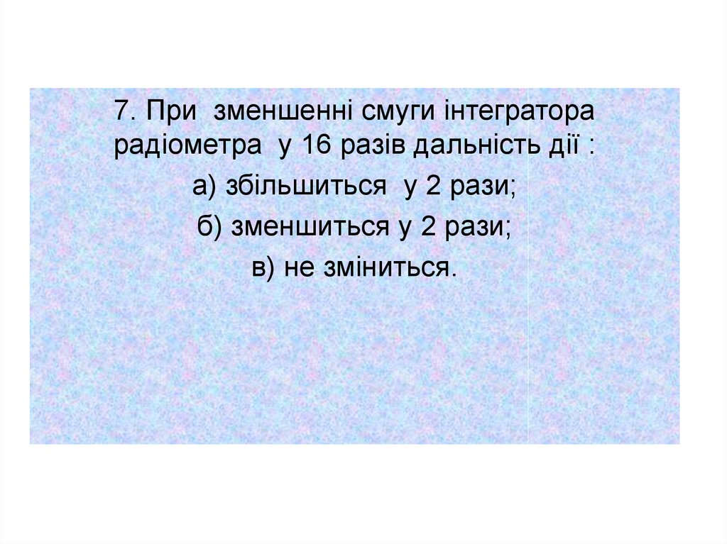 8. Дальність дії радіометра залежить від:а) розмірів діаграми спрямованості, випромінюючої