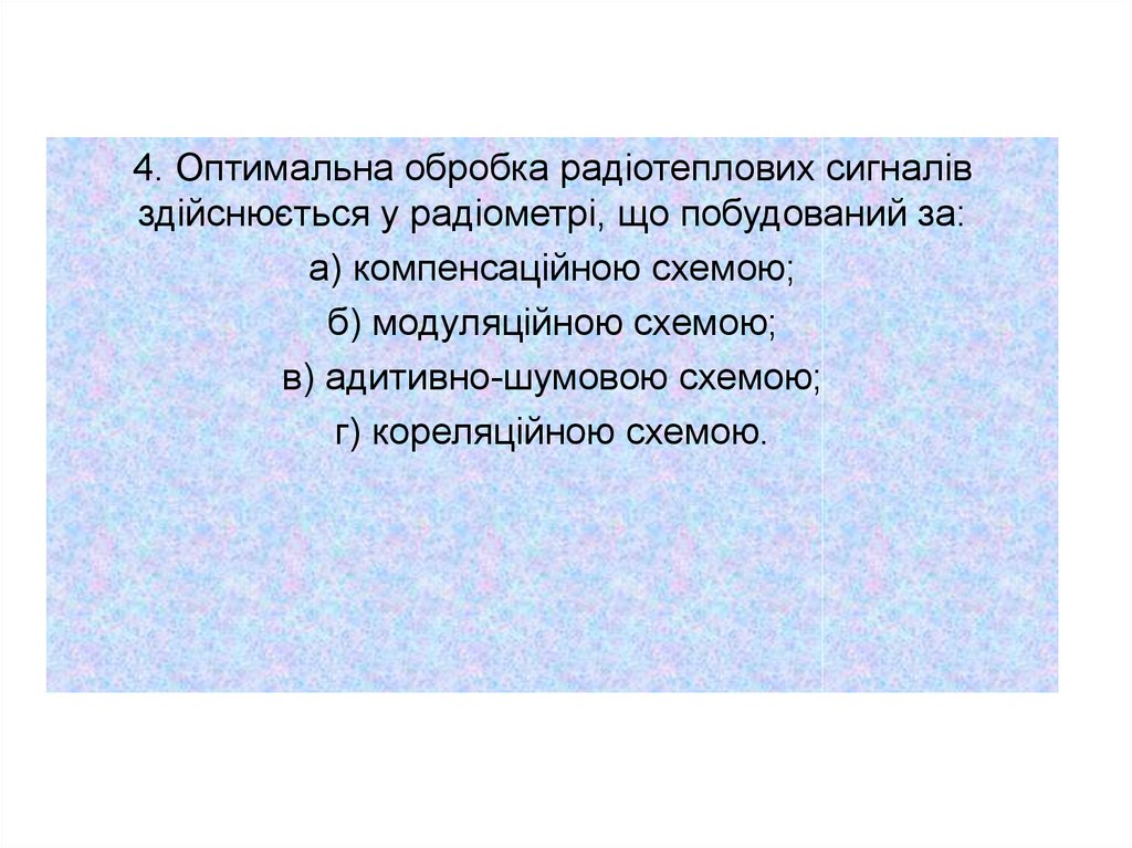 4. Оптимальна обробка радіотеплових сигналівздійснюється у радіометрі, що побудований за: