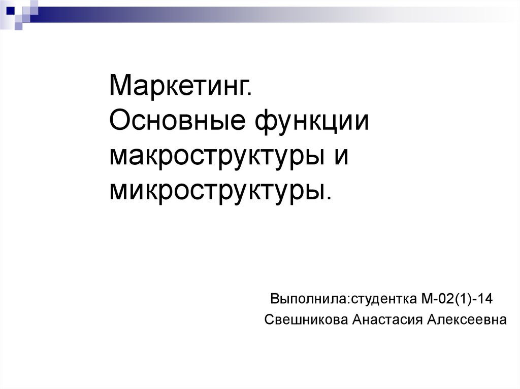 1. Маркетинг. Основные функции макроструктуры и микроструктуры. Выполнила:студентка М-02(1)-14 Свешникова Анастасия Алексеевна