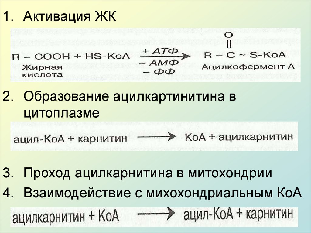 1. Активация ЖК2. Образование ацилкартинитина в