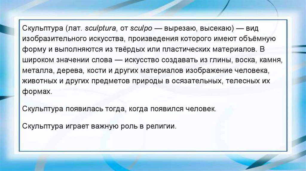 Скульптура (лат. sculptura, от sculpo — вырезаю, высекаю) — видизобразительного искусства, произведения которого имеют объёмную