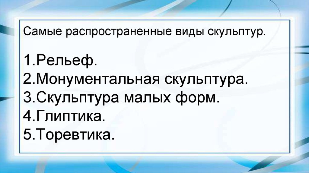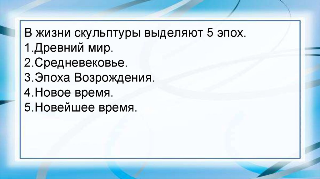В жизни скульптуры выделяют 5 эпох.1.Древний мир.