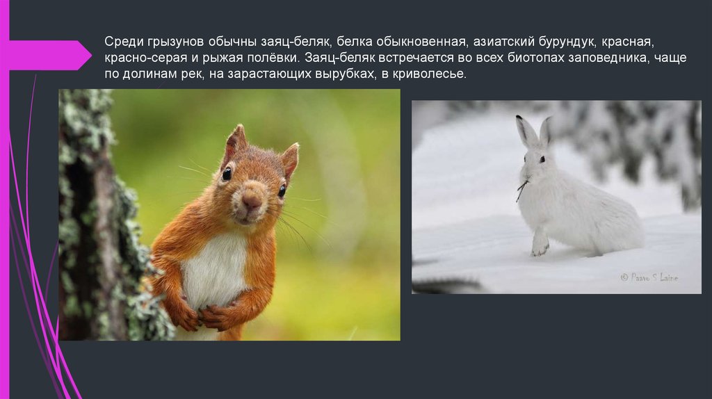 Среди грызунов обычны заяц-беляк, белка обыкновенная, азиатский бурундук, красная,красно-серая и рыжая полёвки. Заяц-беляк встречается во всех биотопах заповедника, чаще