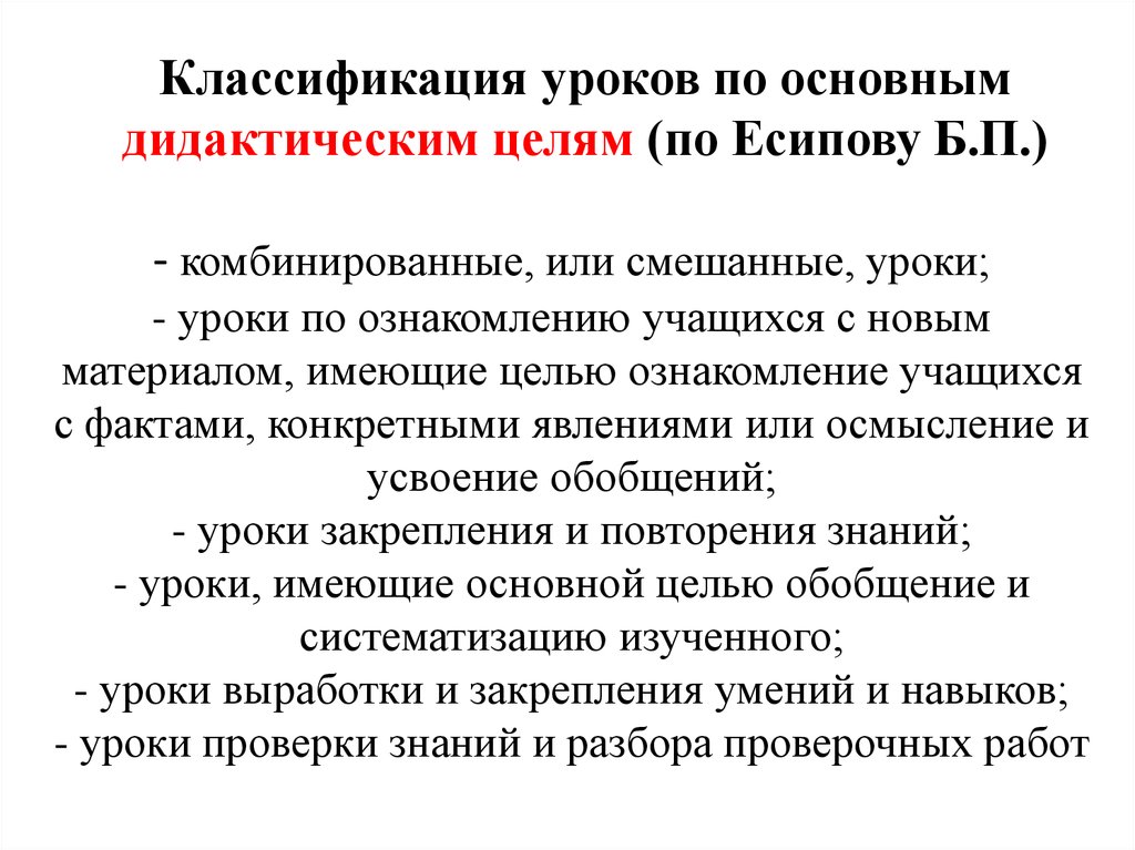 Классификация уроков по основнымдидактическим целям (по Есипову Б.П.)