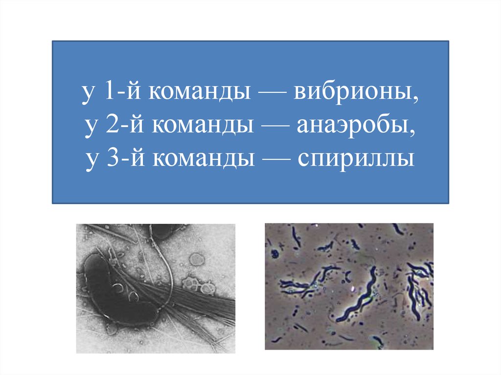 у 1-й команды — вибрионы,у 2-й команды — анаэробы,